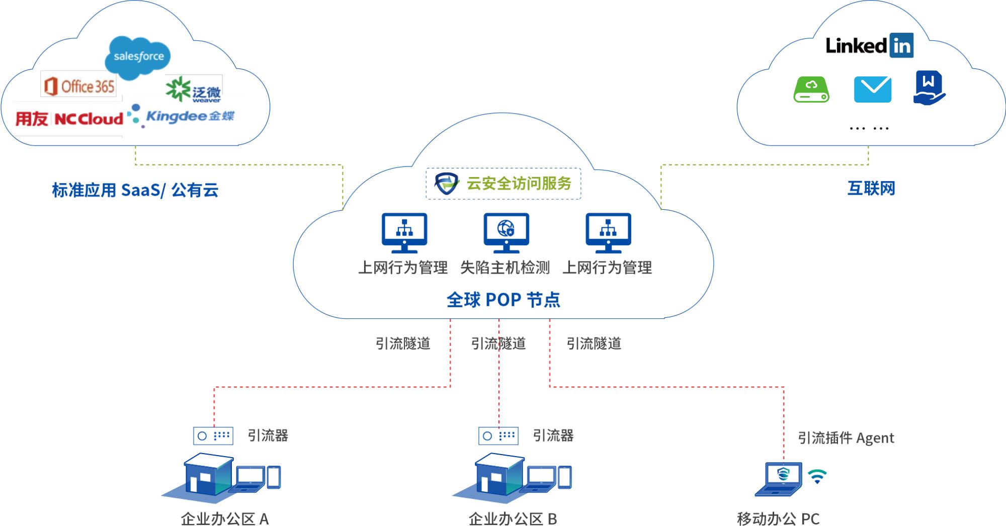 企業(yè)無需購買傳統(tǒng)安全設(shè)備,只需在辦公網(wǎng)環(huán)境下部署引流器(出差/居家遠程辦公時,通過在筆記本終端部署輕量級客戶端),將上網(wǎng)流量牽引至云安全訪問服務(wù)邊緣POP節(jié)點,在云平臺實現(xiàn)違規(guī)上網(wǎng)行為管理、流量控制、應(yīng)用管控,還可擴展數(shù)據(jù)泄密分析能力,為企業(yè)提供更便捷彈性的服務(wù)。